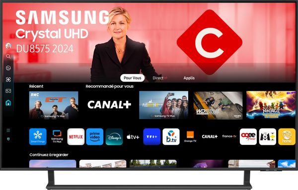 Le téléviseur Samsung TU43DU8575 mesure 43" (108 cm) de diagonale et combine un design fin et minimaliste avec une multitude de fonctionnalités. Compatible HDR10+, ce Samsung TU43DU8575 se dote d'un processeur Crystal Processor 4K pour afficher des images détaillées aux couleurs riches et nuancées. Une fois connecté à la box Internet, il accède à Netflix, Apple TV+, Disney+ et Prime Video et propose également les applications TV des principaux opérateurs télécoms et Canal+. Enfin, ce téléviseur Samsung 4K vous permet de jouer avec votre console ou votre PC, mais aussi directement depuis les services de cloud gaming accessibles depuis son menu Gaming Hub.
