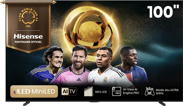 Le téléviseur XXL Hisense 100U7Q est un téléviseur d’exception : format XXL, dalle Mini LED / QLED, fréquence 165 Hz, compatibilité HDR avancée, OS VIDAA U9 fluide et connectique ultra-complète. Il offre une solution haut de gamme pour les passionnés de cinéma, de sport ou de jeu sur très grand écran.