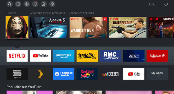 Le téléviseur 4K Hisense 50U72QF adopte des fonctions connectées de Smart TV avec notamment l'accès à Netflix, Prime Video, Youtube...