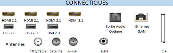 La connectique du téléviseur UHD 4K Samsung Neo QLED QE55QN95A comprend quatre entrées HDMI 2.1, trois ports USB, un connecteur CI+, une sortie audio numérique optique, un port Ethernet et trois prises antennes. On peut ainsi facilement le relier à un lecteur Blu-ray UHD 4K, un lecteur réseau AV et une box TV ainsi qu'à une console de jeux vidéo.