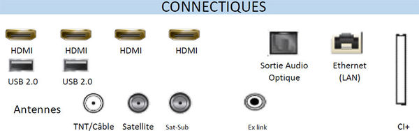 La connectique du téléviseur UHD 4K Samsung QLED QE65Q80A comprend quatre entrées HDMI (dont une HDMI 2.1), deux ports USB, un connecteur CI+, une sortie audio numérique optique, un port Ethernet et trois prises antennes. On peut ainsi facilement le relier à un lecteur Blu-ray UHD 4K, un lecteur réseau AV et une box TV ainsi qu'à une console de jeux vidéo.