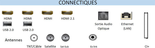 La connectique du téléviseur UHD 4K Samsung Neo QLED QE65QN85A comprend quatre entrées HDMI dont une au standard HDMI 2.1, deux ports USB, un connecteur CI+, une sortie audio numérique optique, un port Ethernet et trois prises antennes. On peut ainsi facilement le relier à un lecteur Blu-ray UHD 4K, un lecteur réseau AV et une box TV ainsi qu'à une console de jeux vidéo.