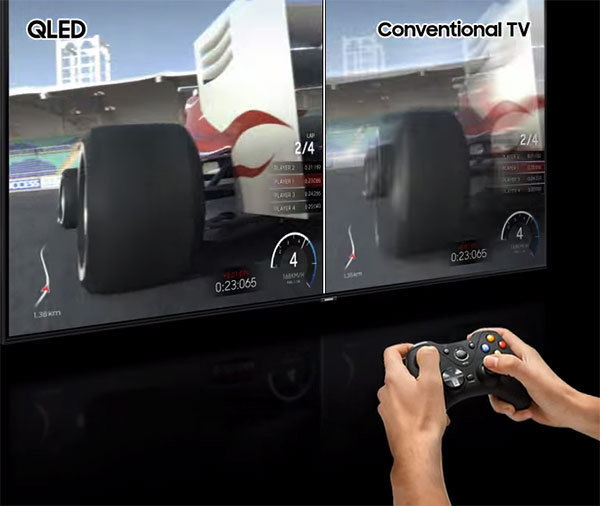 De plus, ce téléviseur QLED Samsung exploite la technologie FreeSync Premium Pro (VRR) qui réduit le décalage et limite le temps de latence entre la génération de l'image par la console et son affichage à l'écran. Cela élimine les risques de tearing et de micro saccades en s'assurant que l'image à l'écran est parfaitement synchronisée pour chaque scène. Et grâce à la fonction ALLM, le téléviseur bascule automatiquement en mode Gaming lorsqu'une console est détectée. Enfin, la connectique HDMI 2.1 est compatible 4K/120 fps pour profiter pleinement d'un framerate optimal avec les consoles Playstation 5 et Xbox Series X.