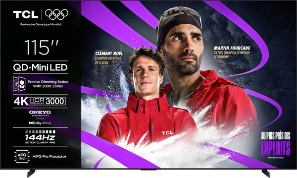 Avec une impressionnante diagonale de 115 pouces, soit 291 centimètres, le téléviseur TCL 115C7K se positionne comme une véritable pièce maîtresse pour tout espace home-cinéma. Cette très grande TV repose sur une dalle QD-Mini LED 4K qui combine la technologie Quantum Dot Pro à un rétroéclairage très précis, assurant une richesse chromatique et un contraste remarquables. Ce téléviseur XXL bénéficie d’un taux de rafraîchissement natif de 144 Hz pour une fluidité optimale. Il est propulsé par le processeur AiPQ Pro, qui affine l’image en temps réel. Côté audio, ce très grand téléviseur embarque un système sonore 4.2.2 développé par ONKYO, compatible Dolby Atmos et DTS Virtual-X, pour une expérience sonore tridimensionnelle immersive. En matière de connectivité, la TCL 115C7K fonctionne sous Google TV et propose de nombreuses fonctions avancées pour les gamers, dont le support HDMI 2.1 avec VRR, ALLM et FreeSync Premium Pro.