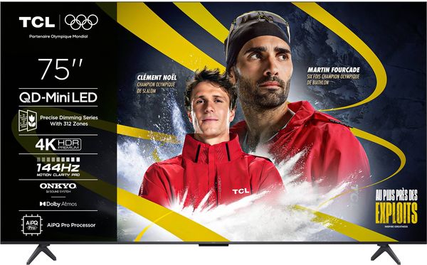 Le grand téléviseur TCL 75C61K est un modèle UHD 4K de 189 cm de diagonale qui dispose des technologies exclusives QLED Pro (Quantum Dot nouvelle génération) et Mini LED pour une couverture colorimétrique étendue et une luminosité très élevée, avec un contraste optimal. Tous les contenus HDR Dolby Vision et HDR10+ profitent d'une très belle qualité d'image, même en conditions d'éclairage ambiant grâce au capteur de luminosité intégré (ajustement automatique de l'image). Le TCL 75C61K s'équipe de Google TV et accède à tous les services de streaming. Les joueurs profitent pour leur part d'une réactivité et d'une fluidité optimales jusqu'en 4K 144 Hz, avec la prise en charge des fonctions ALLM, VRR et AMD FreeSync Premium Pro. Enfin, sa section audio signée Onkyo est compatible Dolby Atmos et DTS Virtual X pour une expérience optimale.