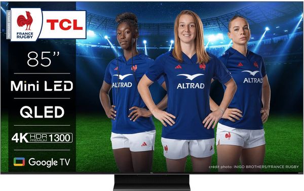 Le TCL 85MQLED80 (85C805) est un très grand téléviseur UHD 4K de 214 cm de diagonale doté d'une dalle QLED (Quantum Dot) qui bénéficie d'un rétroéclairage mini-LED haute performance. Le TCL 85MQLED80 (85C805) conjugue une large palette colorimétrique avec une forte luminosité (jusqu'à 1500 nits) et un contraste optimal. Vous profitez ainsi des contenus HDR Dolby Vision et HDR10+ dans les meilleures conditions. Le TCL 85MQLED80 (85C805) se connecte à Internet sans fil (WiFi) ou par câble Ethernet. Il embarque l'interface Google TV qui permet l'installation de nombreuses applications et donne accès aux services de streaming comme YouTube, Netflix, Prime Vidéo, Disney+, Apple TV+, Spotify et Deezer. Google Assistant est intégré (recherche et contrôle vocal) et la présence d'un module Chromecast autorise la diffusion sans fil de contenus stockés sur smartphone et tablette sur le très grand écran du téléviseur.