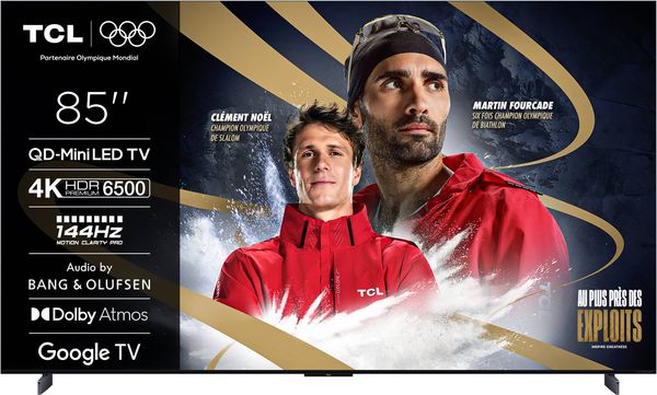 Le très grand téléviseur TCL 85X11K est un modèle UHD 4K de 2,15 m de diagonale équipé des dernières innovations de la marque, dont la technologie QLED PRO avec rétroéclairage Mini LED et dalle CrystGlow HVA pour des performances optimales. Cette TV XXL bénéficie d'une luminosité très élevée de 6500 nits avec jusqu'à 10 368 zones de local dimming pour un contraste optimal. Tous les contenus HDR Dolby Vision et HDR10+ profitent d'une très belle qualité d'image, même en conditions d'éclairage ambiant grâce au capteur de luminosité intégré (ajustement automatique de l'image). Cette TV TCL s'équipe de Google TV et accède à tous les services de streaming. Les joueurs profitent pour leur part d'une réactivité et d'une fluidité optimales jusqu'en 4K 144 Hz avec la prise en charge des fonctions ALLM, VRR et AMD FreeSync Premium Pro. Enfin, sa section audio 6.2.2 canaux signée Bang & Olufsen dispose d'une puissance totale de 120 watts et prend en charge le Dolby Atmos.