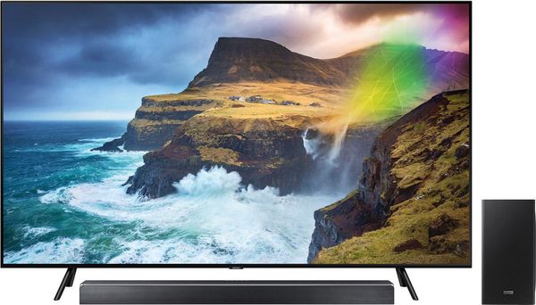 Le téléviseur QLED UHD 4K Samsung QE75Q70R est ici associé à la barre de son Samsung HW-Q80R et son caisson de basses sans fil pour offrir aux spectateurs un spectacle unique avec une grande image UHD 4K et un son surround 5.1.2 compatible Dolby Atmos et DTS:X.