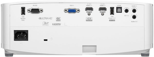 La connectique du vidéoprojecteur Optoma UHD42 comprend également une entrée VGA compatible RGB/YPbPr mais aussi un port USB alimenté pouvant servir à l'alimentation d'un ChromeCast Vidéo ou d'un récepteur HDMI sans fil comme le Optoma WHD200. Le vidéoprojecteur Optoma UHD42 est également doté d'une entrée et d'une sortie audio mini-jack en plus de sa sortie audio numérique optique, sa section audio délivrant 10 watts de puissance.