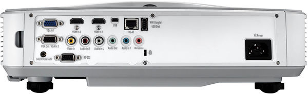 La connectique du vidéo projecteur ultra courte focale Optoma HZ45UST comprend deux entrées HDMI (1.4a), une entrée VGA compatible YPbPr et RVB, une seconde entrée VGA commutable en sortie VGA, une entrée vidéo composite, une entrée audio stéréo RCA ainsi qu'une entrée et une sortie stéréo mini-jack auxquelles s'ajoutent une prise micro mini-jack pour les présentations. On trouve également un port Ethernet et une prise RS-232C pour le contrôle domotique, un port USB alimenté permettant de fournir le courant nécessaire à l'alimentation d'un récepteur HDMI sans fil comme le Optoma HD Cast Pro et un port mini USB pour la maintenance.