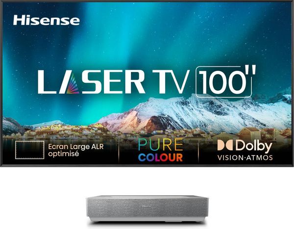 Le Hisense 100L5HD Laser TV comprend un vidéoprojecteur ultra courte focale laser 4K et un écran de projection ultra courte focale anti-reflet de 2,54 m (100") de diagonale, avec ses fixations murales. Conçu pour remplacer la TV du salon, le Hisense 100L5HD Laser TV projette une très grande image 4K Ultra HD en étant placé au pied de l'écran. Il vous accompagnera durant de longues années grâce à la durée de vie très étendue de sa lampe laser estimée à 25 000 heures au minimum.