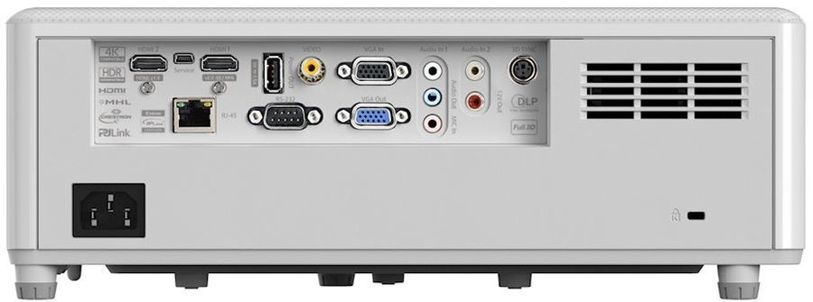 Côté connectique, le vidéoprojecteur Optoma HZ40ST dispose de 2 entrées HDMI (une au standard HDMI 2.0 compatible 4K avec downscaling 1080p et une au standard HDMI 1.4a 3D), une entrée VGA compatible YPbPr/RVB ainsi que deux entrées et une sortie audio au format mini-jack (3,5 mm) accompagnées d'une prise microphone pour animer réunions et présentations. S'y ajoutent un port RS232 et un port RJ45 pour l'intégration domotique, un port USB alimenté de type A pour la connexion éventuelle d'un module de réception HDMI sans fil Optoma WHD200 ou d'un Chromecast Vidéo, ainsi qu'un second port USB au format micro-USB estampillé "Service", réservé aux interventions techniques et à d'éventuelles mises à jour du logiciel interne de l'appareil.