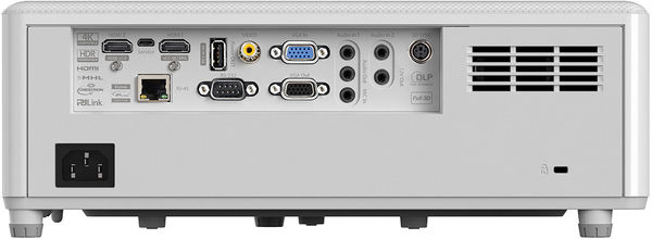 Côté connectique, le vidéoprojecteur Optoma ZH406 dispose de 2 entrées HDMI (une au standard HDMI 2.0 et une au standard HDMI 1.4a 3D), une entrée VGA compatible YPbPr/RVB ainsi que deux entrées et une sortie audio au format mini-jack (3,5 mm) accompagnées d'une prise microphone pour animer réunions et présentations. S'y ajoutent un port RS232 et un port RJ45 pour l'intégration domotique, un port USB alimenté de type A pour la connexion éventuelle d'un module de réception HDMI sans fil Optoma WHD200 ou d'un Chromecast Vidéo, ainsi qu'un second port USB au format micro-USB estampillé "Service", réservé aux interventions techniques et à d'éventuelles mises à jour du logiciel interne de l'appareil.