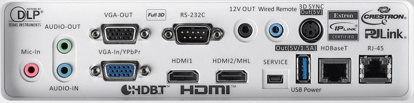 En plus de ses deux entrées HDMI, le vidéoprojecteur Optoma ZH500T possède une entrée HDBaseT. Prisée par les professionnels pour sa fiabilité, celle-ci assure le transfert simultané des vidéos Full HD 1080p non compressées, de l'audio, du réseau et des commandes de contrôle via un seul câble Ethernet (CAT5 ou supérieur) jusqu'à 100 mètres sans perte de signal. Optimisé pour l'intégration, ce vidéoprojecteur Optoma ZH500T est compatible avec les protocoles de contrôle PJLink et Telnet mais aussi Crestron, Extron IPLink et AMX. Il est également doté d'un port RS232.