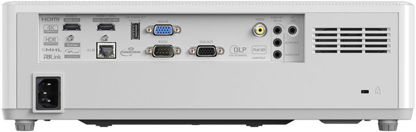 Côté connectique, le vidéoprojecteur Optoma ZH506e dispose de 2 entrées HDMI (une au standard HDMI 2.0 et une au standard HDMI 1.4a 3D), une entrée VGA compatible YPbPr/RVB ainsi qu'une entrée et une sortie audio au format mini-jack (3,5 mm). S'y ajoutent un port RS232 et un port RJ45 pour l'intégration domotique, un port USB alimenté de type A pour la connexion éventuelle d'un module de réception HDMI sans fil Optoma WHD200 ou d'un Chromecast Vidéo, ainsi qu'un second port USB au format micro-USB estampillé "Service", réservé aux interventions techniques et à d'éventuelles mises à jour du logiciel interne de l'appareil.