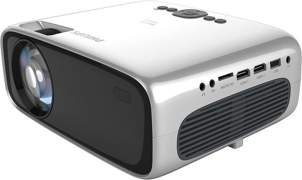 un projo compact pour petits espaces. Points positifs : petite taille, connectique sur le côté pour mettre le projo en vertical et diffuser l'image au plafond (visio au lit!). la possibilité de diffuser le son en wifi sur barre de son ou enceintes wifi. Permet d'avoir une image plus grande que marqué sur la notice (j'avais mon projo à 3 m de l'écran et pas de perte). HP intégrés raisonnables si le projo est pas trés loin de l'écran. S'il est au plafond c'est perturbant. Points négatifs : Produit sorti en 2020 qui n'est plus suivi par Philips (donc pas de réparations envisageables) en 2022 Le gros problème : pas de trou sous le projo pour fixation au plafond. Obligé de le mettre dans un caisson une télécommande qui a du mal à capter Le ventilo fait un peu de bruit. Le mien est tombé en panne au bout de 11 mois .