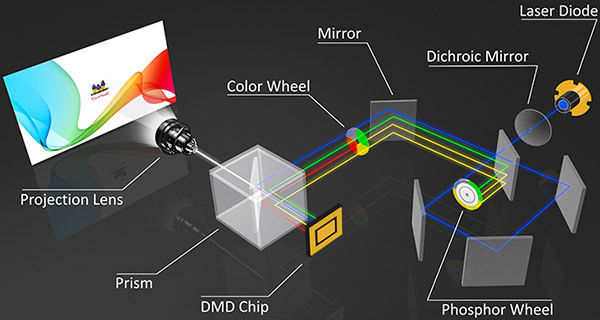 À la différence des vidéoprojecteurs laser équipés de diodes laser RVB, le vidéoprojecteur Viewsonic LS860WU adopte pour sources lumineuses des diodes laser bleues. Celles-ci sont combinées à une roue au phosphore qui en pivotant agit en trois temps de trois manières différentes sur la lumière bleue. Soit elle la laisse passer sans la modifier, soit elle la transforme en lumière jaune, soit elle la transforme en lumière verte. Une roue chromatique synchronisée sur la roue au phosphore est chargée ensuite de laisser passer alternativement les différentes composantes lumineuses de l'image (rouge, vert, bleu et jaune) avant qu'elle n'atteigne la puce à micro-miroirs. Modulées à très haute vitesse plusieurs centaines de fois par seconde, les composantes couleur de l'image projetées sont perçues comme un tout par l'oeil du spectateur grâce au phénomène de persistance rétinienne. Ce dispositif offre une grande richesse colorimétrique et une excellente précision chromatique.