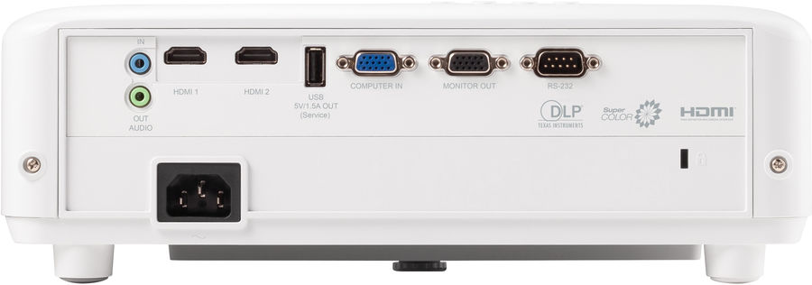 La connectivité du vidéoprojecteur Viewsonic PX703HD comprend deux entrées HDMI (1.4 compatibles 3D), une entrée et une sortie VGA ainsi qu'une entrée et une sortie audio mini-jack. Notez que le Viewsonic PX703HD possède un haut-parleur alimenté par une amplification de 10 watts pour diffuser directement le son des films et des jeux vidéo.