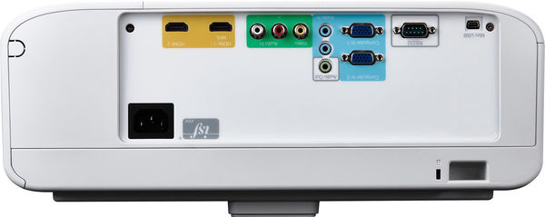 La connectique du projecteur focale ultra courte Viewsonic PX800HD comprend notamment 2 entrées HDMI (1.4a) et 2 entrées VGA compatibles YPbPr et RVB. On trouve également un port mini-USB alimenté permettant de fournir le courant nécessaire à l'alimentation d'un récepteur HDMI sans fil comme le Optoma WHD200.