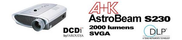 Le A+K S230 est un projecteur ultra sophistiqué à un prix très raisonnable ! Doté de la résolution SVGA native, il répond à tous vos besoins, aussi bien dans une salle de conférence, dans un salon dédié home-cinéma qu'au cours de vos déplacements professionnels... Doté de tous les éléments techniques indispensables à une projection de qualité, les modèles A+K S230 et A+K X230 (résolution XGA) présentent des qualités intrinsèques de haut de gamme. Technologie DCDi Faroudja, correction numerique de trapèze, matrice DLP, mode Eco, ce projecteur très complet assure un rendu informatique et vidéo de grande qualité. Le choix de la performance.