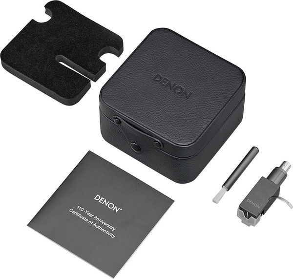 La cellule phono MC Denon DL-A110 est une série limitée exclusive proposée par Denon pour célébrer ses 110 ans d'existence. Elle se présente dans un luxueux coffret de transport accompagnée d'un porte cellule au standard SME et d'une brosse de nettoyage pour le diamant. Pour cette édition anniversaire, le porte cellule de la Denon DL-A110 reproduit exactement le modèle originairement conçu en 1910 avec ses couleurs graphite-argent. Un certificat d’authenticité estampillé avec l’approbation de l’ingénieur en chef de Denon est livré avec cette cellule qui bénéficie d'une garantie premium de 5 ans (hors stylet).