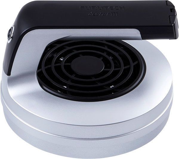 Les passionnés de disques vinyles comme les utilisateurs de CD audio sont parfaitement conscients de l'impact négatif des charges statiques sur les supports analogiques et optiques (LP, CD et DVD) : bruits, craquements, qualité de reproduction audio et vidéo diminuée. Le dispositif anti-statique Furutech Destat III se propose d'y remédier très simplement en quelques secondes seulement. Il suffit de placer votre disque (disque vinyle, CD audio, DVD, Blu-ray) sur le Furutech Destat III ou de maintenir ce dernier sur le disque de votre choix puis d'appuyer sur un bouton ! Le puissant ventilateur élimine la poussière tandis que le générateur d'ions du Furutech Destat III élimine la charge statique du disque en libérant un flux d'ions positifs et négatifs parfaitement équilibré.