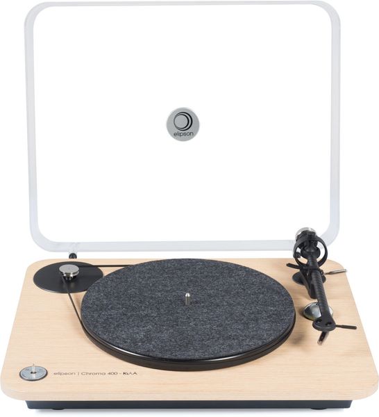 La platine vinyle Elipson Chroma 400 RIAA est un modèle manuel à entraînement par courroie doté d'un pré-ampli phono intégré. Elle reprend le design sobre et racé des platines Elipson Alpha et Omega en y ajoutant de nouvelles technologies de pointe développées par la marque française. Pré-équipée d'une cellule à aimant mobile Ortofon OM-10E, cette platine assemblée en France dans les locaux d'Elipson se distingue par son nouveau plateau en acier, son contrepoids gradué, ainsi que par l'ajout d'un nouveau bras de lecture en carbone associé à un lève-bras, mais aussi d'un nouveau système d'axe du plateau, d'un nouvel ensemble moteur et suspension et d'une carte électronique améliorée.