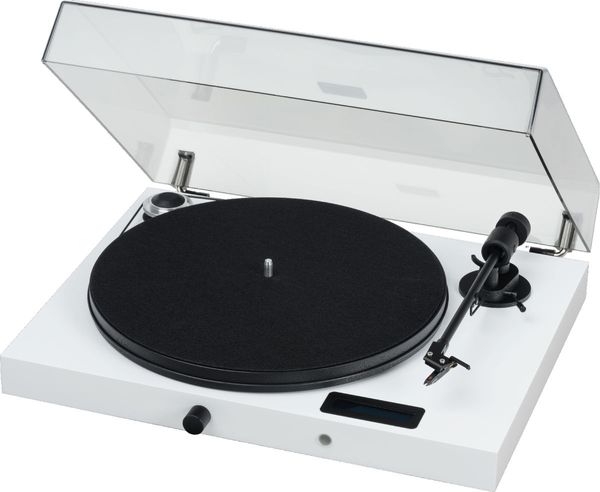 La platine vinyle Pro-Ject Juke Box E est compatible avec tous les disques microsillon 33 et 45 tours/minute. Elle adopte un système d'entraînement par courroie à changement de vitesse manuel : il suffit de déplacer la courroie de l'une des gorges de la poulie d'entraînement à l'autre pour passer d'une vitesse à l'autre. Le plateau de cette platine vinyle Pro-Ject est réalisé en contreplaqué, mesure 300 mm de diamètre et dispose d'un couvre plateau en feutrine. Le roulement principal est réalisé en acier inox avec support en bronze. La platine vinyle Pro-Ject Juke Box E est équipée d'un bras de lecture droit en aluminium de 8,6” de longueur, avec une cellule Ortofon OM5e pré-montée et réglée en usine.