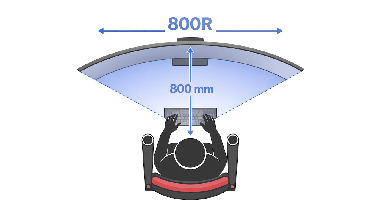 La distance recommandée est d’environ 80 cm, ce qui correspond au rayon de courbure. Cette distance permet d’avoir l’ensemble de l’écran dans le champ de vision sans effort excessif.