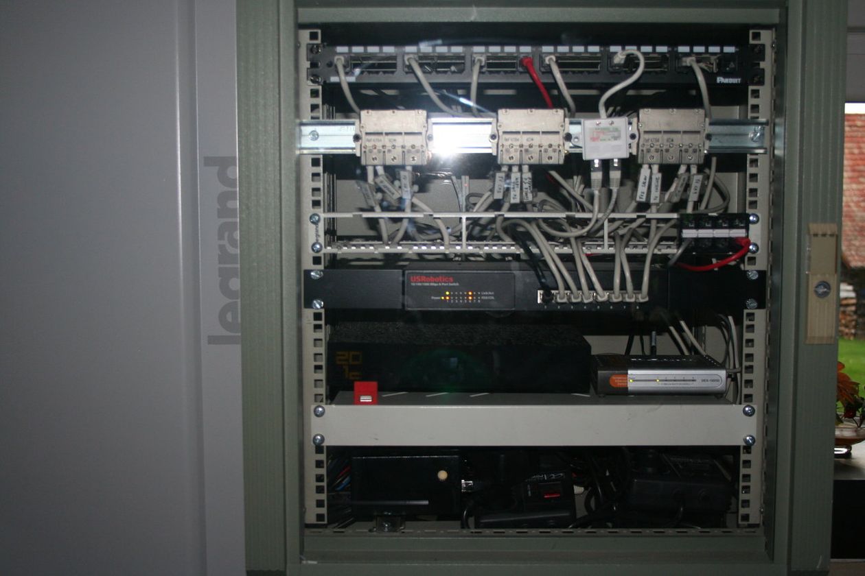 1 panneau de brassage 24 ports, 3 mélangeurs vidéo 4 voies chacun, 1 répartiteur téléphonique 8 voies, 1 switch gigabit 8 ports, 1 Freebox révolution en dégroupage total équipé de modules freeplugs.