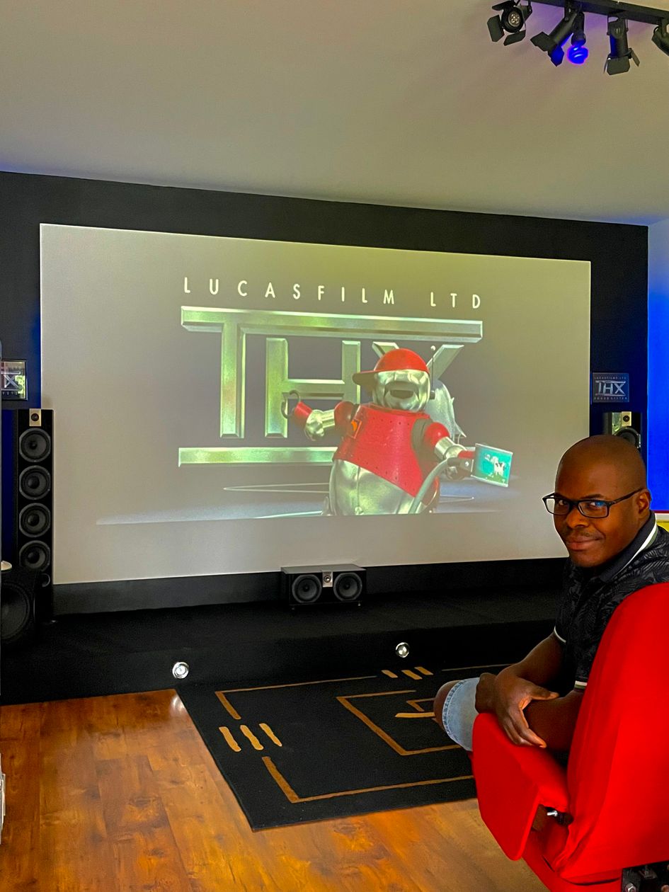 La salle dédiée occupe 10 m de long par 5 m de large. La partie cinéma est resserrée sur 5 m x 5 m car la partie arrière reçoit un billard qui permet de jouer en profitant de la projection de clips par exemple. L'écran entièrement réalisé en bois et placo offre de superbes dimensions : la taille de l'image finale est de 3,55 m de longueur sur 2 m de hauteur, ceci grâce au vidéoprojecteur fixé au plafond, à environ 5 m de recul.