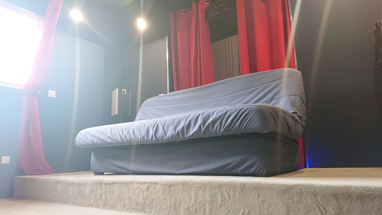 Un salon dédié, avec un positionnement des colonnes orientées typiquement Hifi (à 60° avec un recul d'écoute égal à la distance entre les deux colonnes) avec un côté cinéma en positionnant le canapé sur une estrade.