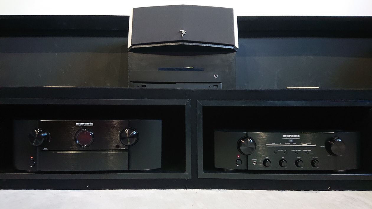 - Création d'un estrade recouverte de tissu noir pour encastrer les ampli et appareils multimédia. Les câbles et disques durs et autre blocs d'alimentation se retrouvent ainsi cachés. Et ranger les bluray et jeux.