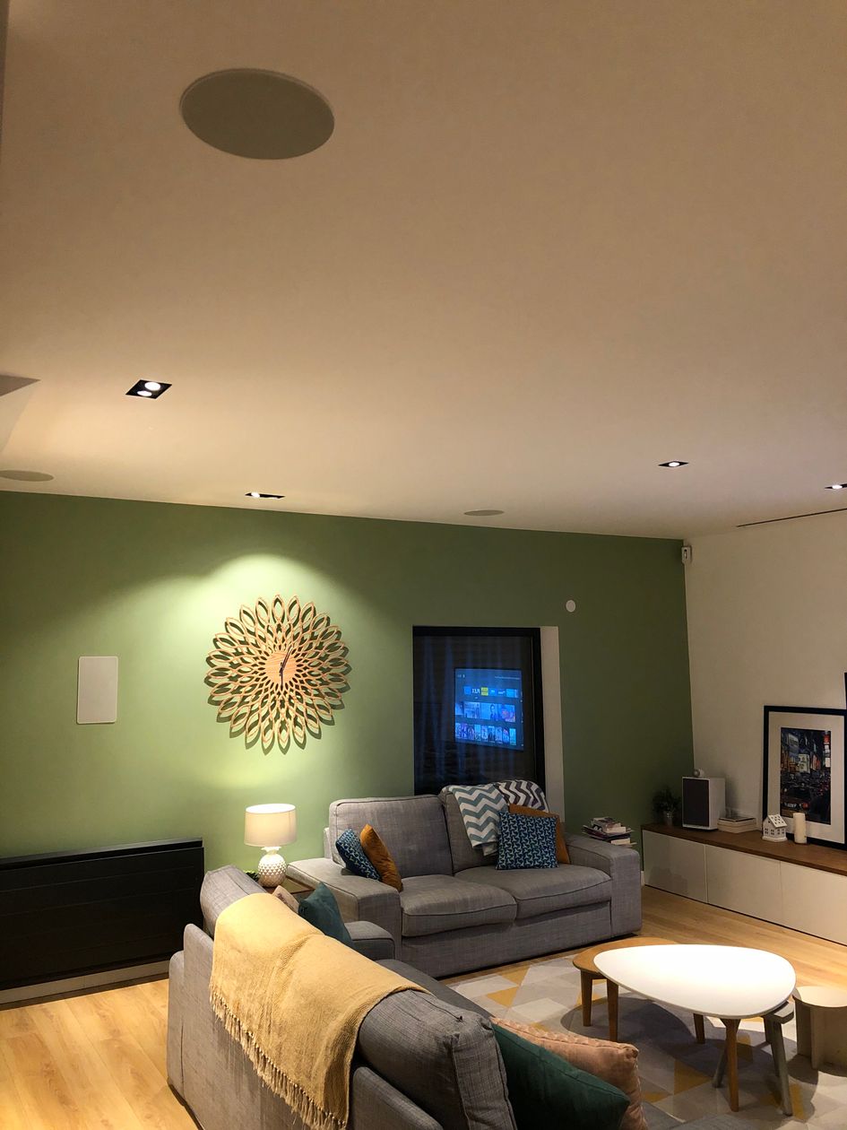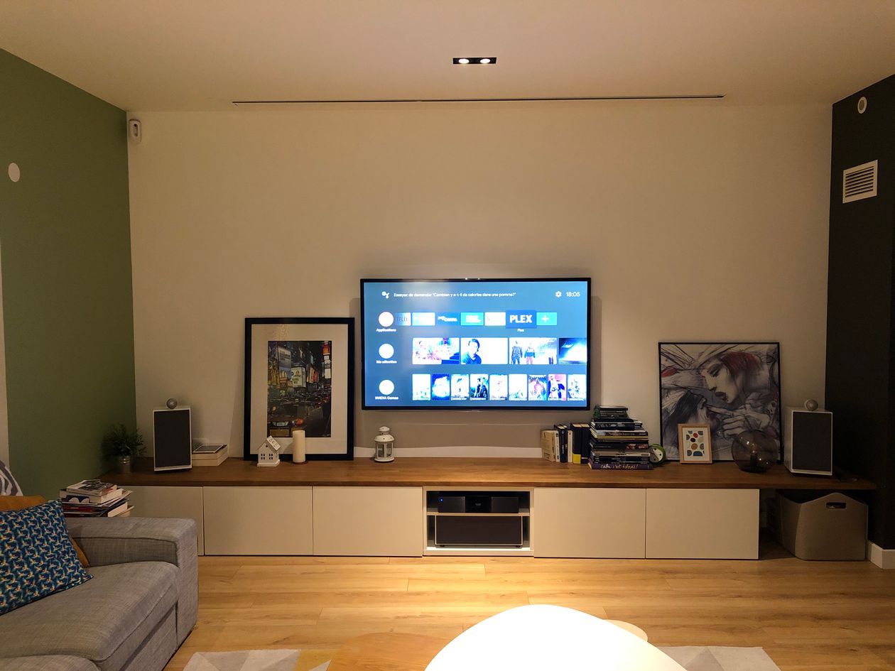 L'installation a été faite dans le cadre de la rénovation totale d'une grange, on a donc pu faire un peu ce qu'on voulait. L'objectif principal était de dissimulé autant que je pouvais les éléments, ou en choisir qui collaient avec l'ambiance générale, d'où le choix des enceintes B&W visibles et esthétiques, le choix des enceintes encastrables Definitive Technology au plafond et dans les murs, ainsi que de l'écran AV Concept encastré et motorisé.