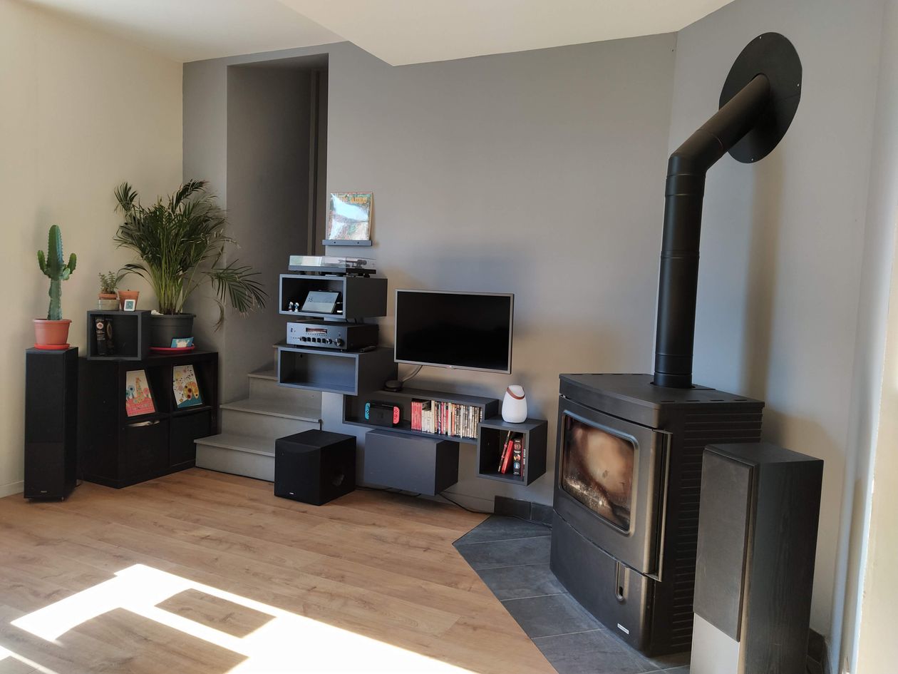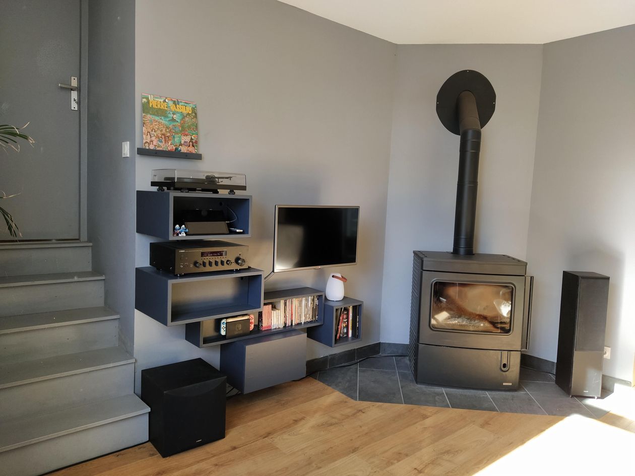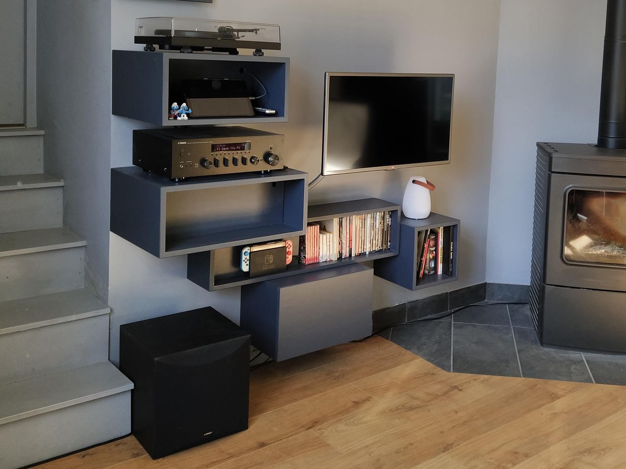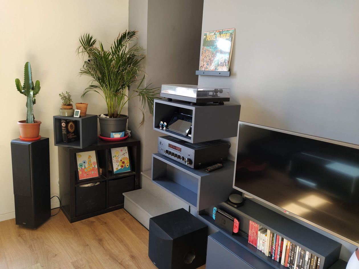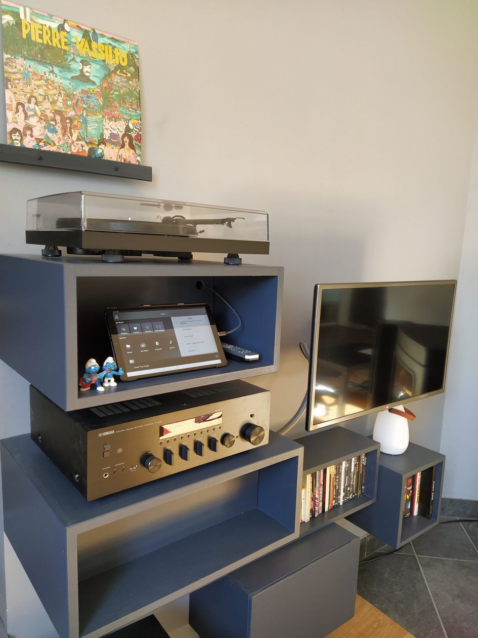 Je cherchais à avoir une station d'écoute confortable pour ma collection de vinyle mais aussi pour profiter des nombreux fichiers numériques présent sur mon NAS. L'ampli est relié directement en RJ45. Je voulais au maximum effacer les câbles. J'ai designé, et réalisé des blocs en MDF et je les ai installé sur la cloison en prenant en compte un équilibre visuel mais aussi des contraintes technique de poids et de cable management.
