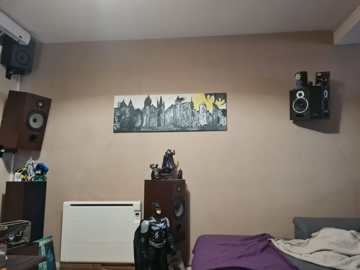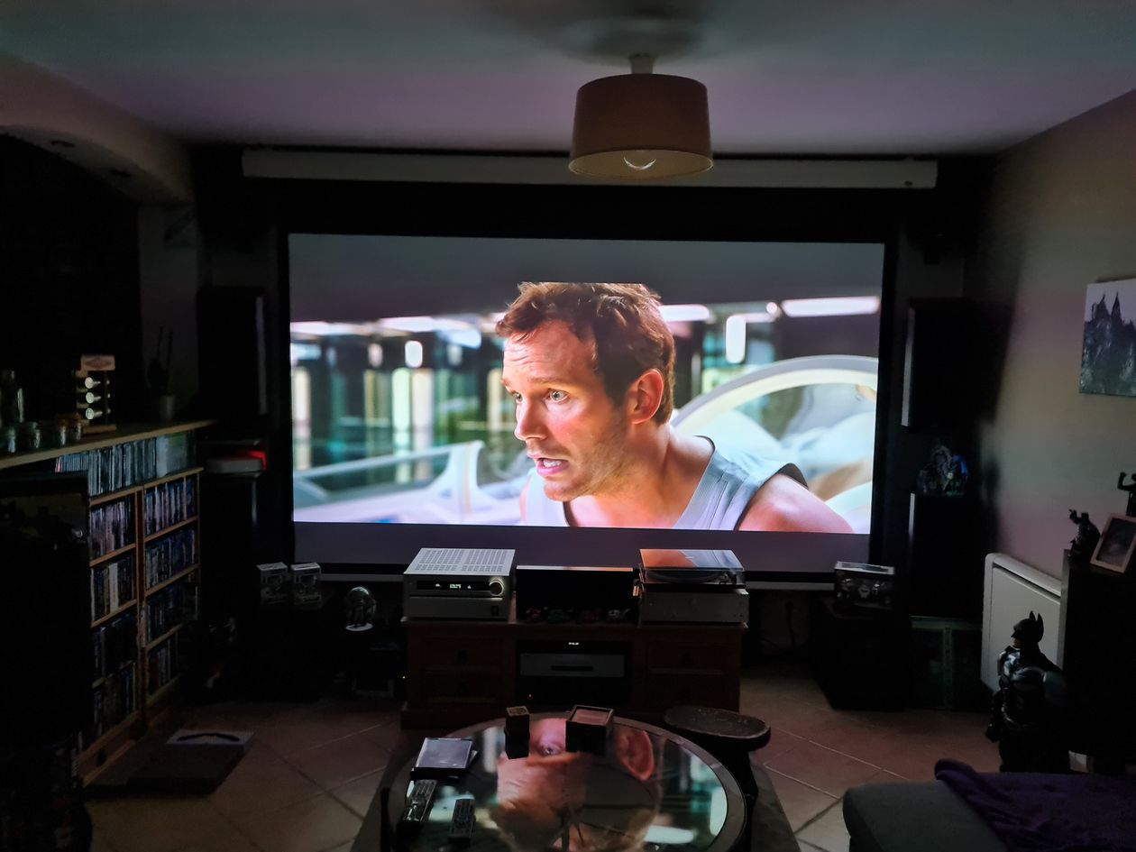 Home cinéma 9.2.2 sur écran de projection motorisé Celexon de 280x158 en 126" tout ça en 4K. Les enceintes sont des JMLAB de la série OPAL et deux DAvis Acoustics Bipolaire pour les surrounds. Je voulais regarder des films sur grand écran tout en restant dans le salon. Donc j'ai peint les murs avec un enduit couleur taupe et qui ne brille pas. Pour ce qui est du son j'ai juste ajouté un tapis sur le sol pour évité que cela résonne et mis des pointes de découplage sous les Caissons. Les enceintes sont fixées au mur et non sur des pieds pour éviter une prise au sol. Pour mon vidéoprojecteur il m'a fallu trouver un Câble HDMI de plus de 10 mètres sans perte de signal et j'ai donc opté pour un Kordz PRS3 et j'en suis très satisfait. Pour le son entre mon Panasonic et mon Onkyo j'ai jeté mon dévolue sur des Audioquest Forest en 2 mètres. Pour mon prochain achat je pense investir dans un ascenseur pour cacher mon vidéoprojecteur.