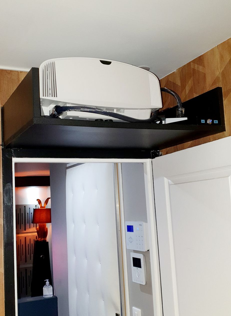 Le vidéoprojecteur se trouve dans une autre pièce, posé sur un support créé au-dessus de la porte et projetant à travers une lucarne. Tous les câbles de l'installation passent dans les murs et le faux-plafond.