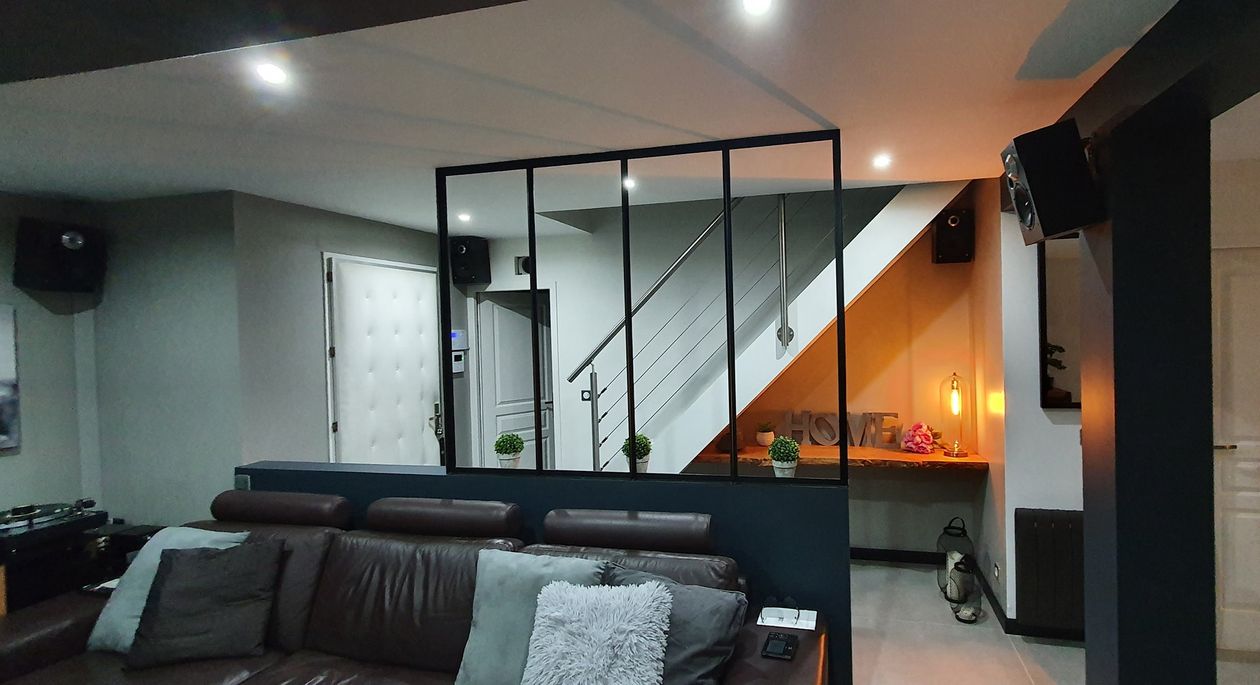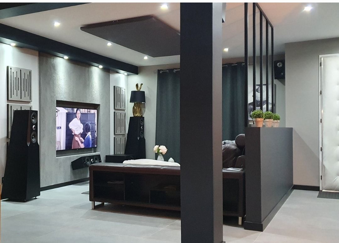 Étant sensible à l'esthétique et au design, qui pour moi apporte un réel plus dans l'appréciation d'une installation, je suis parti sur une déco moderne typée industrielle. Il était également primordial d'épurer la scène avant. Une contre-cloison en MDF a été montée sur tasseaux, dans laquelle se trouve la niche de la télé.