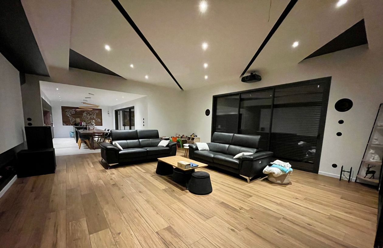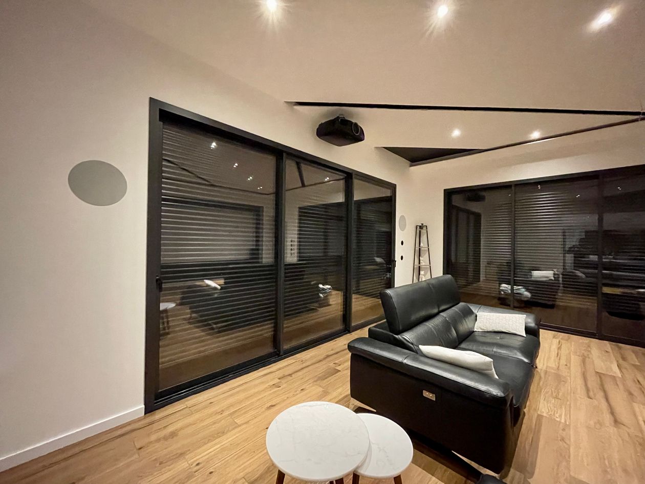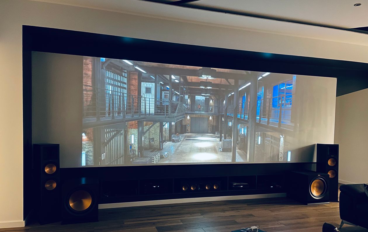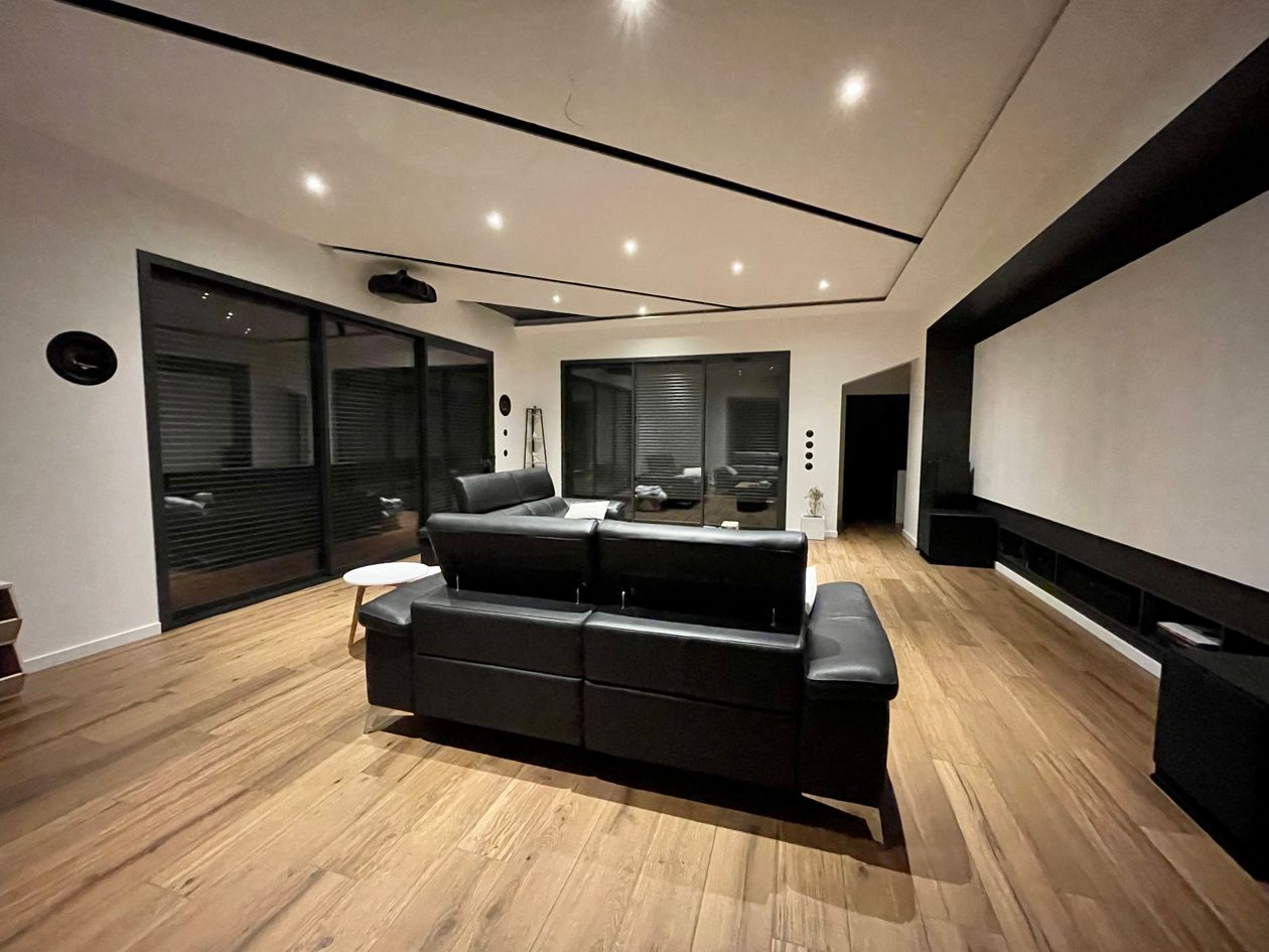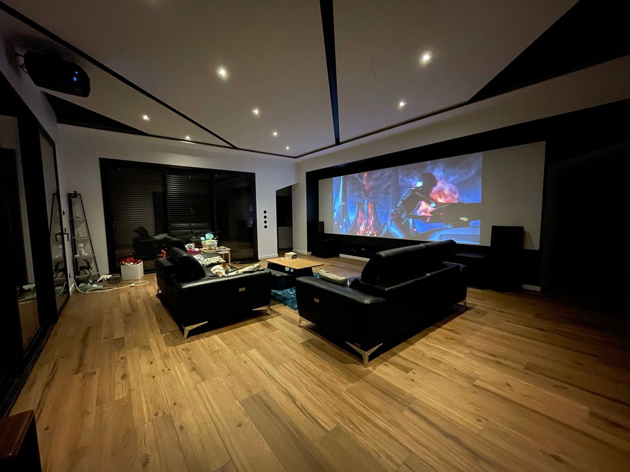 Cette pièce a été la première zone dessinée sur mon projet de construction. Beaucoup de réflexion sur les différentes possibilités d'orientation, le casse-tête a été de trouver le vidéo projecteur qui, par le recul, aurait une lentille motorisée me permettant de basculer du 16/9 au 2.35 tout en conservant la hauteur du support de projection (qui est du BA13 de 1,8 m de haut) et de conserver une ligne moderne et épurée. Image 16/9 : 3,11m de base. Image 2/35 : 4,11 m de base