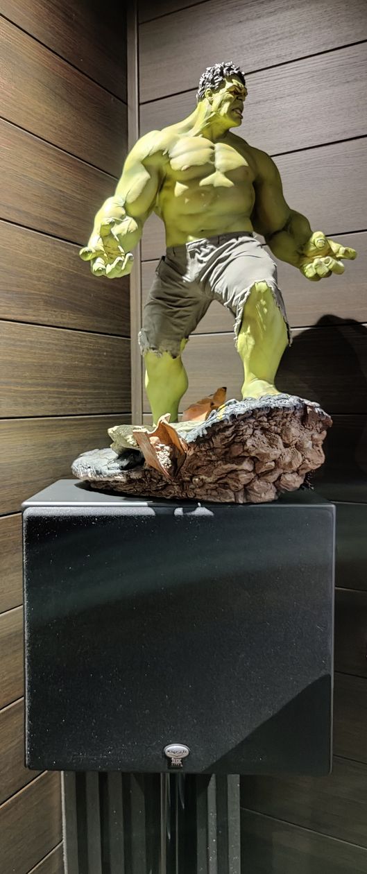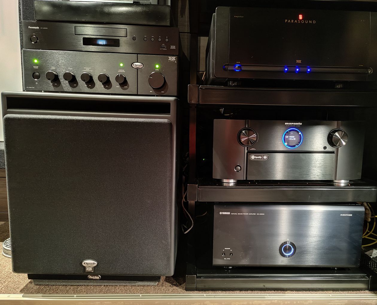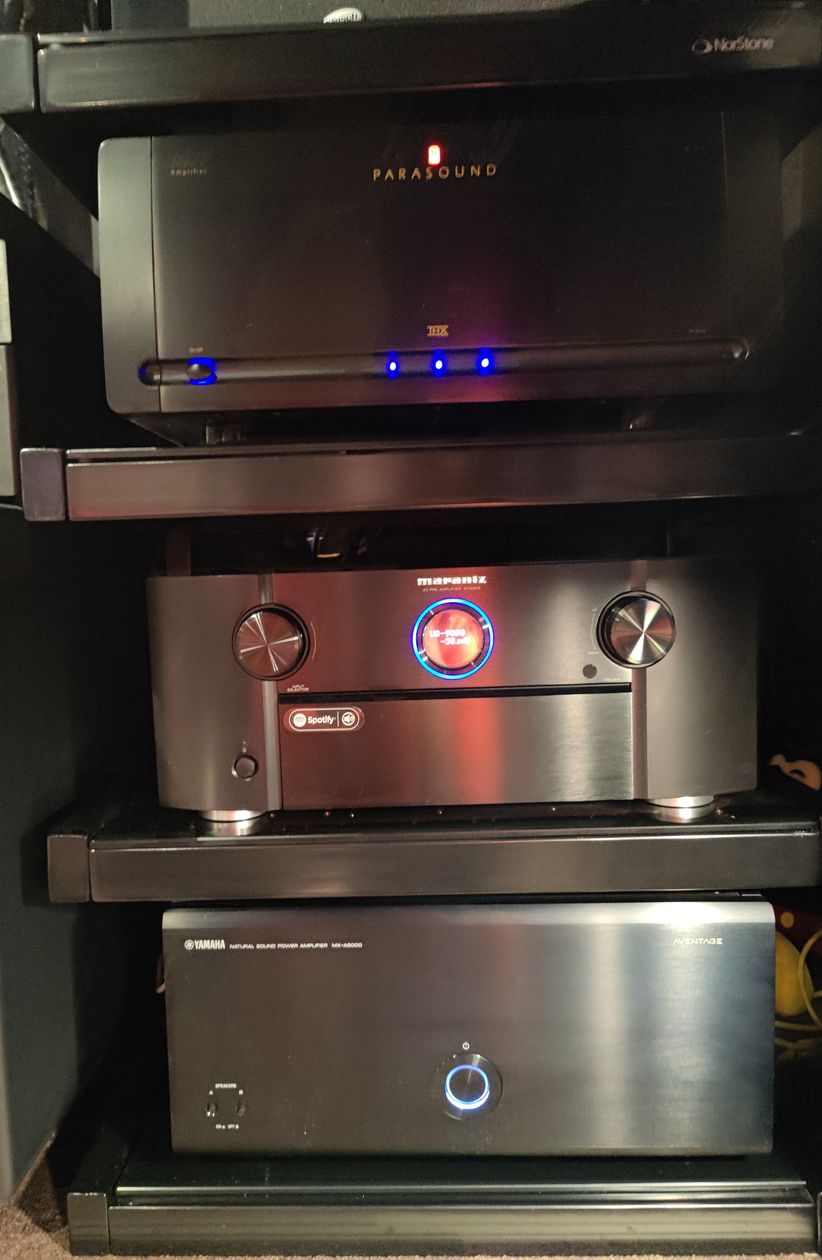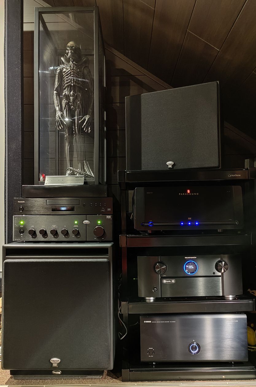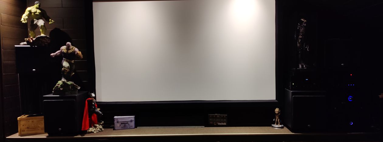 Une exigence pour moi était d'avoir les enceintes derrière la toile, afin de recréer au maximum l'effet cinéma et d'avoir les dialogues sortant à hauteur de l'image. J'ai acheté un kit Klipsch THX ultra 2 en 7.2 auxquels j'ai rajouté 4 enceintes Atmos toujours de chez Klipsch. J'ai dernièrement rajouté 2 enceintes supplémentaires en front wide identiques à celles derrière l'écran. Je suis équipé d'un préampli Marantz AV8805 qui gère donc les 13 enceintes, un ampli de puissance Parasound A31 pour les frontales, un ampli de puissance Yamaha MX-A5000 pour le reste des enceintes et l'ampli Klipsch THX ultra 2 prévu pour les caissons. Un lecteur UHD Panasonic UB 9000 pour lire les films diffusés par un projecteur Epson 9400 calibré pour ma toile micro perforée Harkness de 265 cm de base en 16/9. J'ai utilisé la calibration automatique audyssey via l'application smartphone et ça me convient très bien.