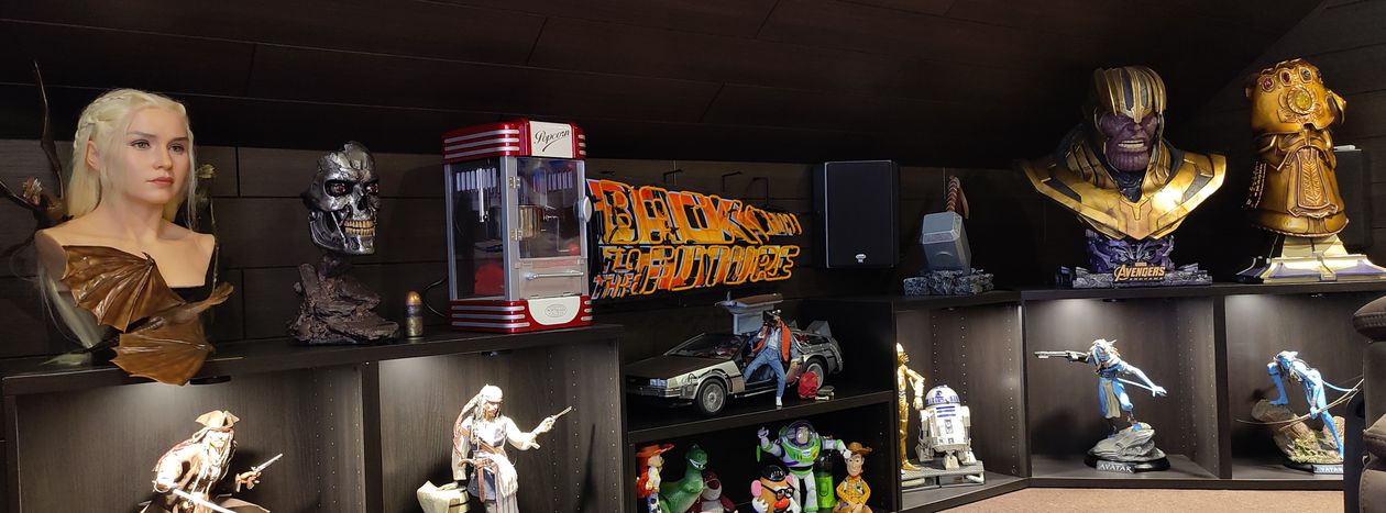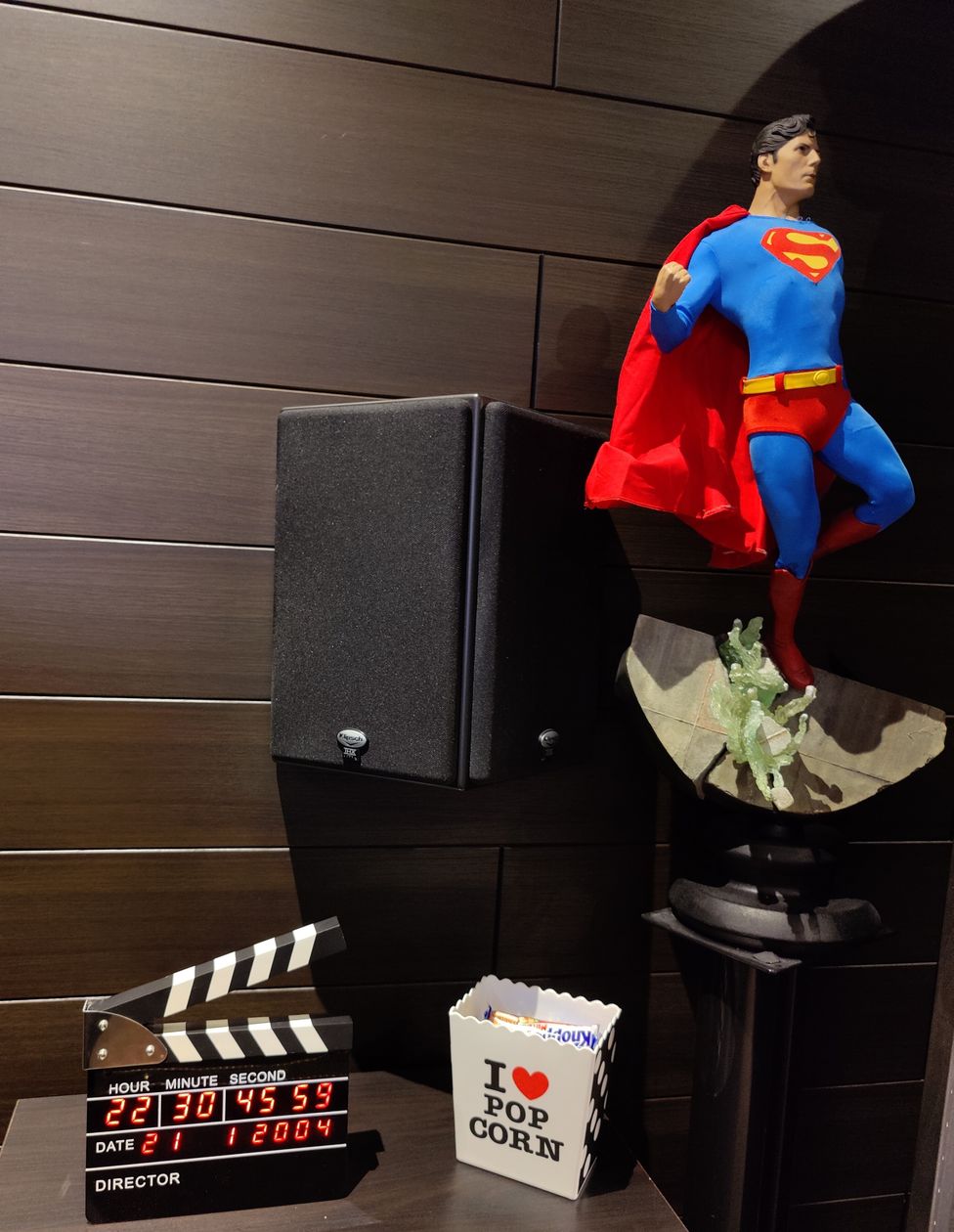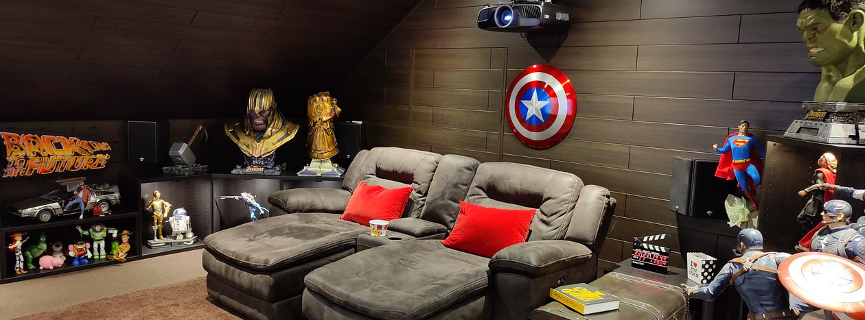 N'étant pas un grand bricoleur, il ne fallait pas non plus trop de travaux à réaliser. Le choix fût donc d'utiliser une des 4 chambres qui mesure 5,25 m sur 4,20 m. Les 2 contraintes étaient une pente de toit d'un côté et une fenêtre. Il a été décidé de faire la pièce sur la largeur et d'avoir la pente sur notre droite, ce qui fait que les quatre surround ont été placées juste un peu plus haut que les oreilles une fois assis. Une moquette brune et un tapis plus épais devant l'écran, un lambris brun foncé partout en recouvrant la fenêtre par un ingénieux système de panneau amovible pour pouvoir y accéder pour aérer de temps à autres y compris au plafond ce qui a permis de placer 4 Atmos et une isolation en laine de roche derrière la scène frontale + 4 bass traps et le tour était joué. Un minimum de travaux et nous allions pouvoir profiter de cette salle de cinéma à la maison.