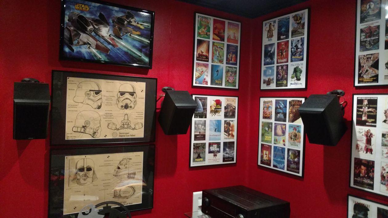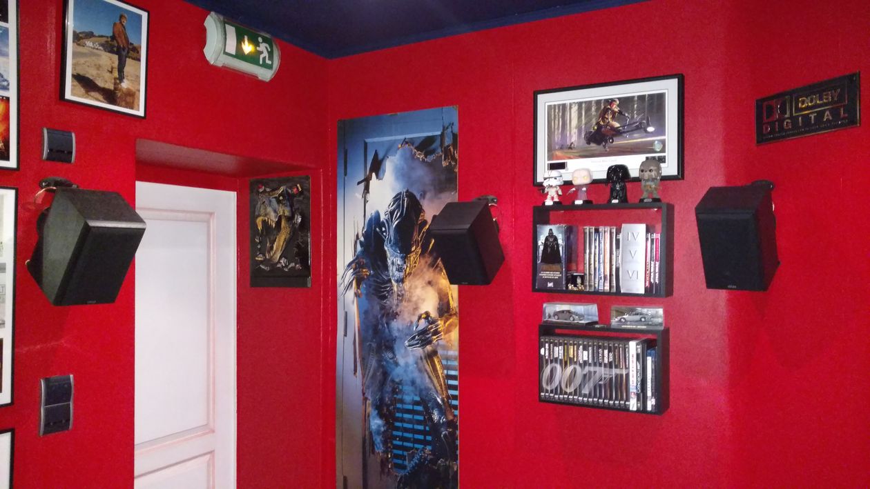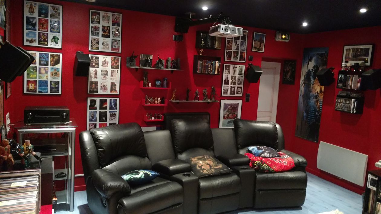 Passionné par le grand écran depuis l’adolescence, ébloui par les images et le son du 1er épisode de star wars en 1977 (juste avant sa sortie en France), je rêvais d’avoir un jour ma propre salle de cinéma. 25 ans après, en achetant une maison très ancienne en Moselle, j’ai eu l’opportunité de transformer une partie du grenier, située au même étage que les chambres, et qui servait autrefois au stockage du grain, en salle dédiée. Les travaux m’ont pris quasiment un an et demi, du début de l’année 2006 jusqu’à l’été 2007, weekends et congés. Béotien dans ce type de chantier, à l'exception du raccordement électrique au réseau de la maison, j’ai néanmoins réalisé tous les travaux moi-même, en suivant fidèlement les conseils de mon beau frère, hyper compétent dans tous les métiers utiles pour ce genre de projet. C’est lui qui a donc assuré toute la connexion électrique de la salle au réseau de la maison. En résumé, j’ai dû arracher et refaire le plancher en intégrant un isolant acoustique entre les 2 couches de contreplaqué de 22 mm (j’ai posé un parquet une fois les travaux terminés), concevoir un cube dont les parois ne touchent pas les murs existants, pas toujours vraiment "à l’équerre", créer un plafond qui n’existait pas, et percer un mur pour créer un couloir d’accès à la salle. Les parois, montées sur rails, sont constituées de 2 plaques de plâtre de 13 mm superposées, derrières lesquelles j’avais préalablement inséré une couche de laine de verre entre les rails (un revêtement mural acoustique spécial de 5 mm d’épaisseur a été posé à la fin des gros travaux puis peint en rouge). J’avais également pré installé les gaines et tiré les câbles des prises électriques et des interrupteurs, et procédé de la même manière pour le câblage des enceintes et du caisson de graves. Le plafond est constitué d’une seule épaisseur de plaques de plâtres de 13 mm, vissées sur les solives, dans laquelle j’ai intégré des spots pour l’éclairage. J’ai rempli avec de la laine de roche, sur une hauteur de 20 cm, les espaces entre les solives, puis recouvert le tout avec des panneaux de contreplaqué de 22 mm. La laine de roche est isolée des spots grâce à des pots de fleurs posés à l’envers au dessus de chaque spot. J'ai également réalisé une estrade devant l'écran, cloisonnée et remplie de laine de roche, recouverte de panneaux de moquette. J'y ai posé les enceintes frontales (sur pointes de découplage) et le caisson. Je n’ai pas investi dans des panneaux acoustiques spécifiques, que je trouvais trop chers, j’ai misé sur les éléments de décoration qui ornent les parois de la salle et sur le mobilier présent pour jouer le même rôle. Je trouve que le rendu est plutôt "bon", mais seul un véritable expert pourrait donner un avis objectif. La porte d’entrée a été conçue spécialement pour l’isolation phonique, je l’ai récupérée chez un artisan ébéniste qui l’avait fabriquée pour un client qui n’était jamais venu la chercher, elle est très efficace.